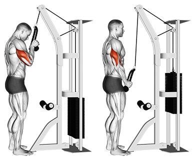Here on the left the lifter has his triceps (highlighted in red) at full stretch, he can even take a pause there that will burn like hell as the muscle is actively resisting the force of the cable stack.