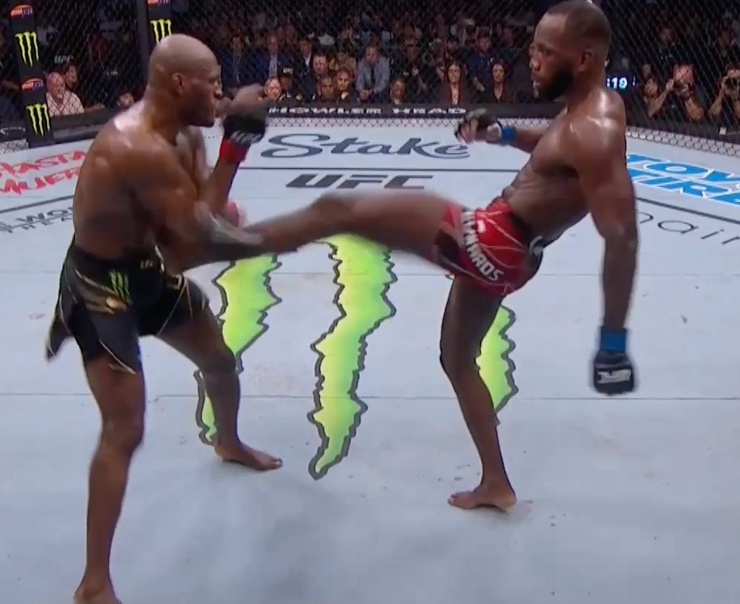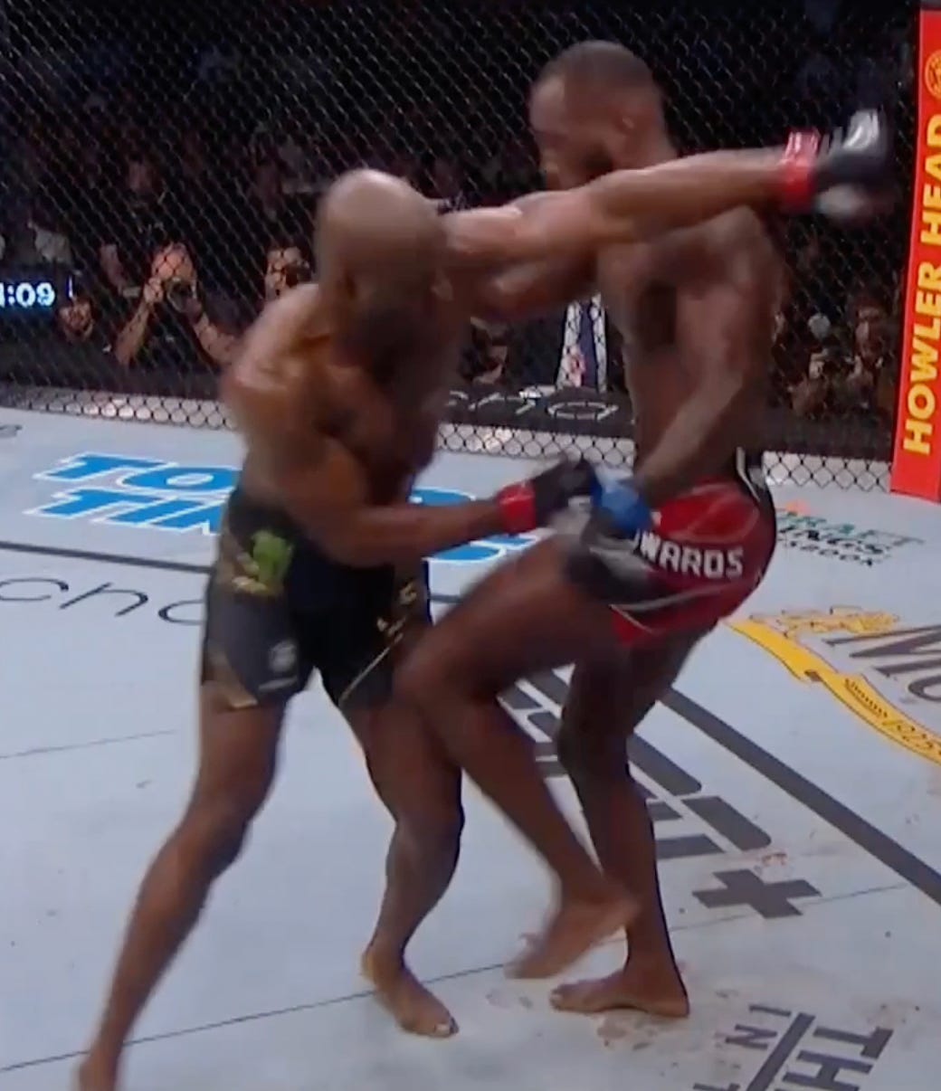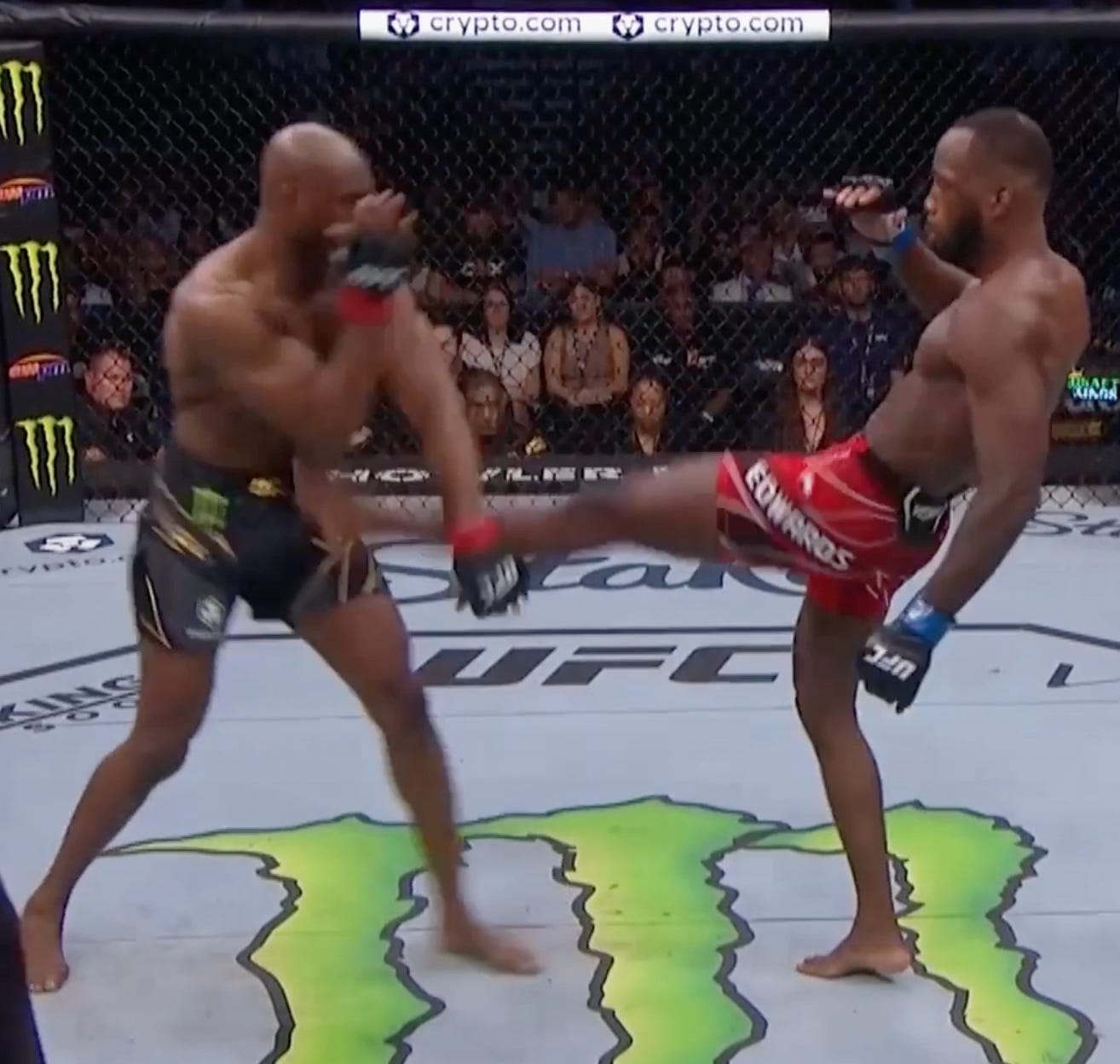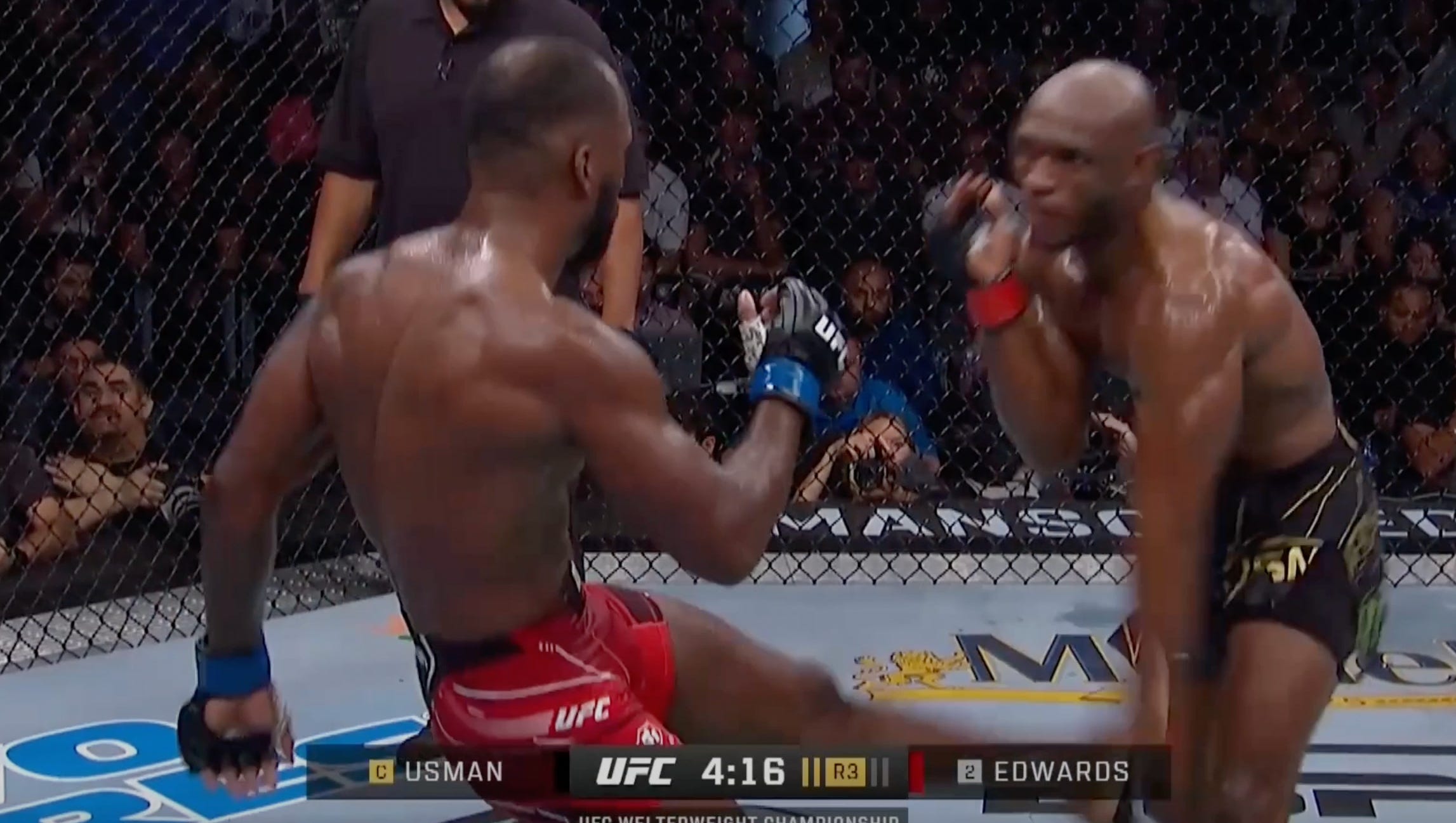 While intercepting knees and clinches allowed Leon to halt Usman’s offense, feinting and kicking allowed him to work from the outside. When not pressed up against the cage, Leon was able to feint into kicks with little to no resistance. While a feinted 1-2 most led to Usman’s unconscious body on the canvas, it was due to an accumulation of kicks to the leg and body that opened up this opportunity as well. Inside low kicks, sidekicks to the leg, and front snap kicks to the body all landed with regularity for Edwards.