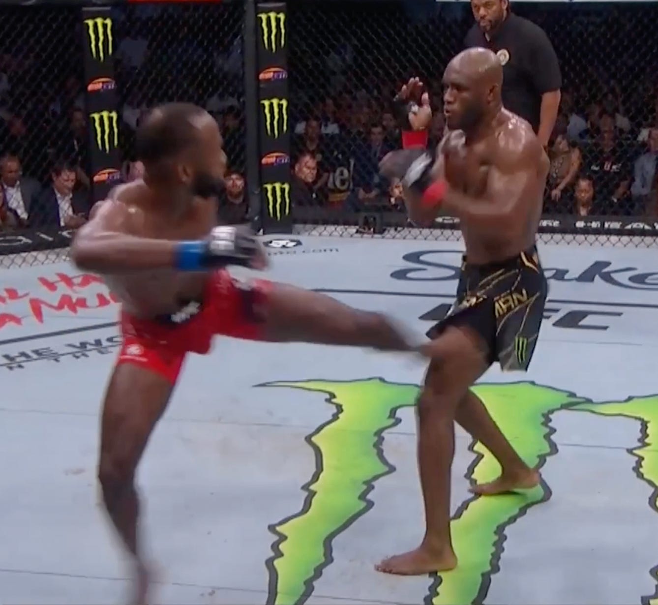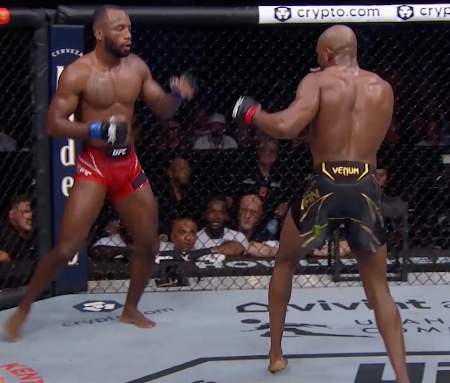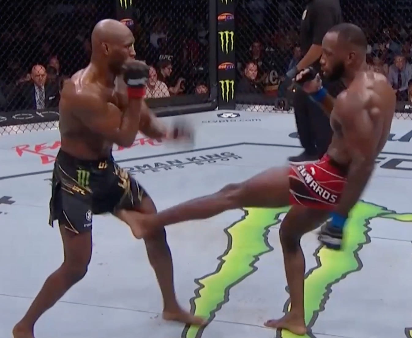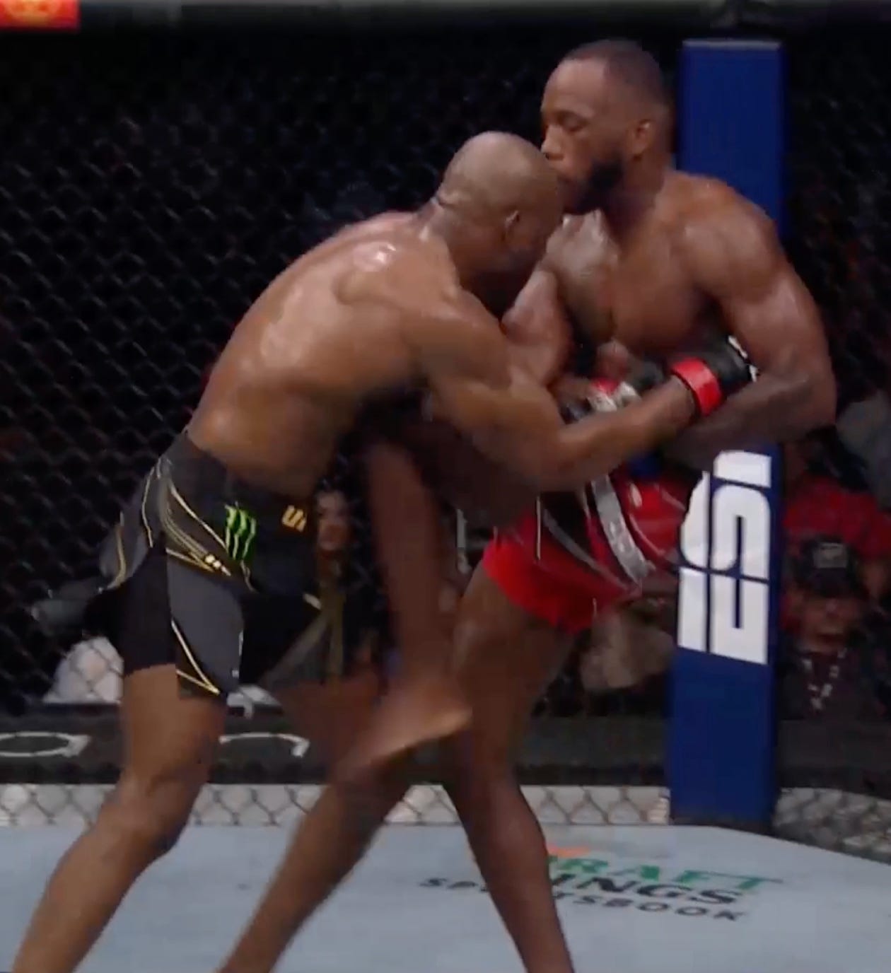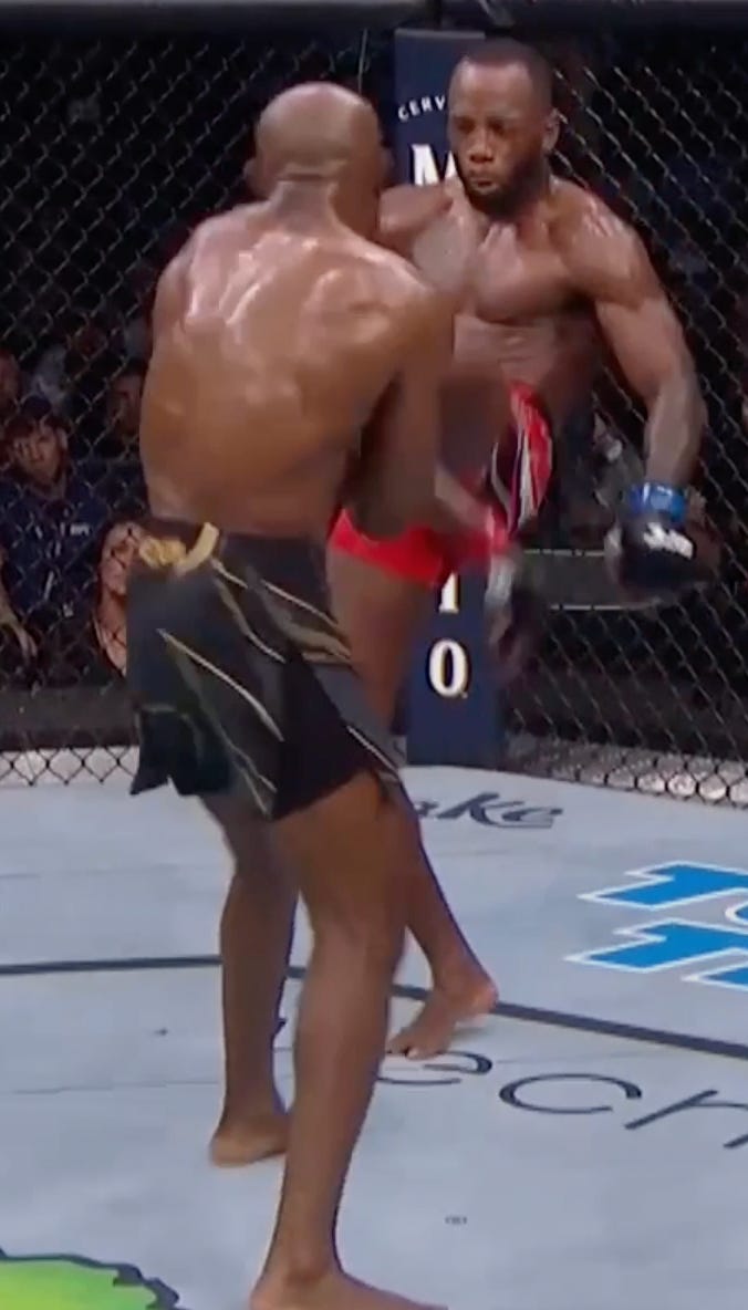 While intercepting knees and clinches allowed Leon to halt Usman’s offense, feinting and kicking allowed him to work from the outside. When not pressed up against the cage, Leon was able to feint into kicks with little to no resistance. While a feinted 1-2 most led to Usman’s unconscious body on the canvas, it was due to an accumulation of kicks to the leg and body that opened up this opportunity as well. Inside low kicks, sidekicks to the leg, and front snap kicks to the body all landed with regularity for Edwards.