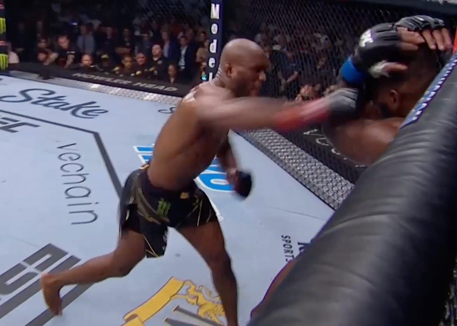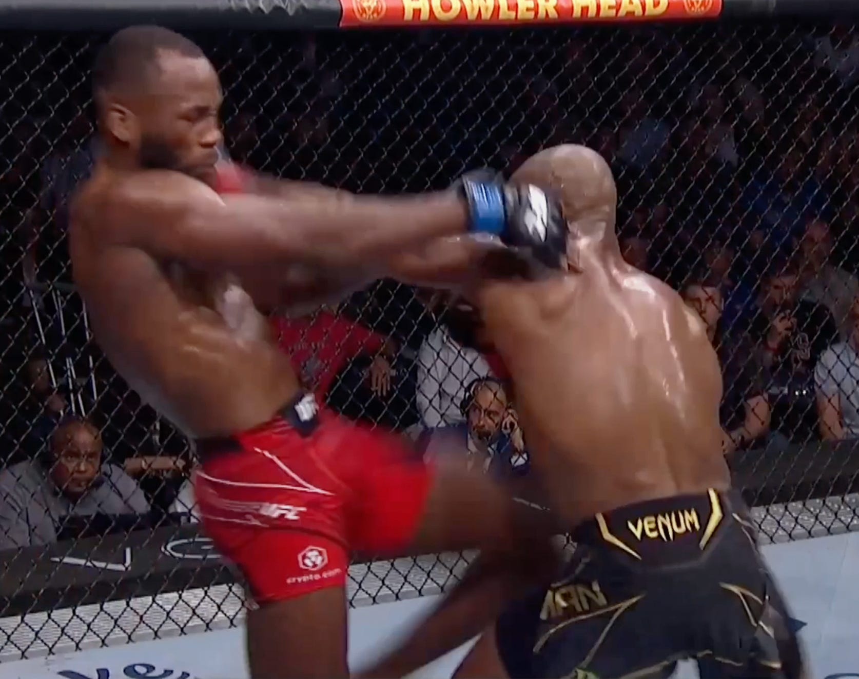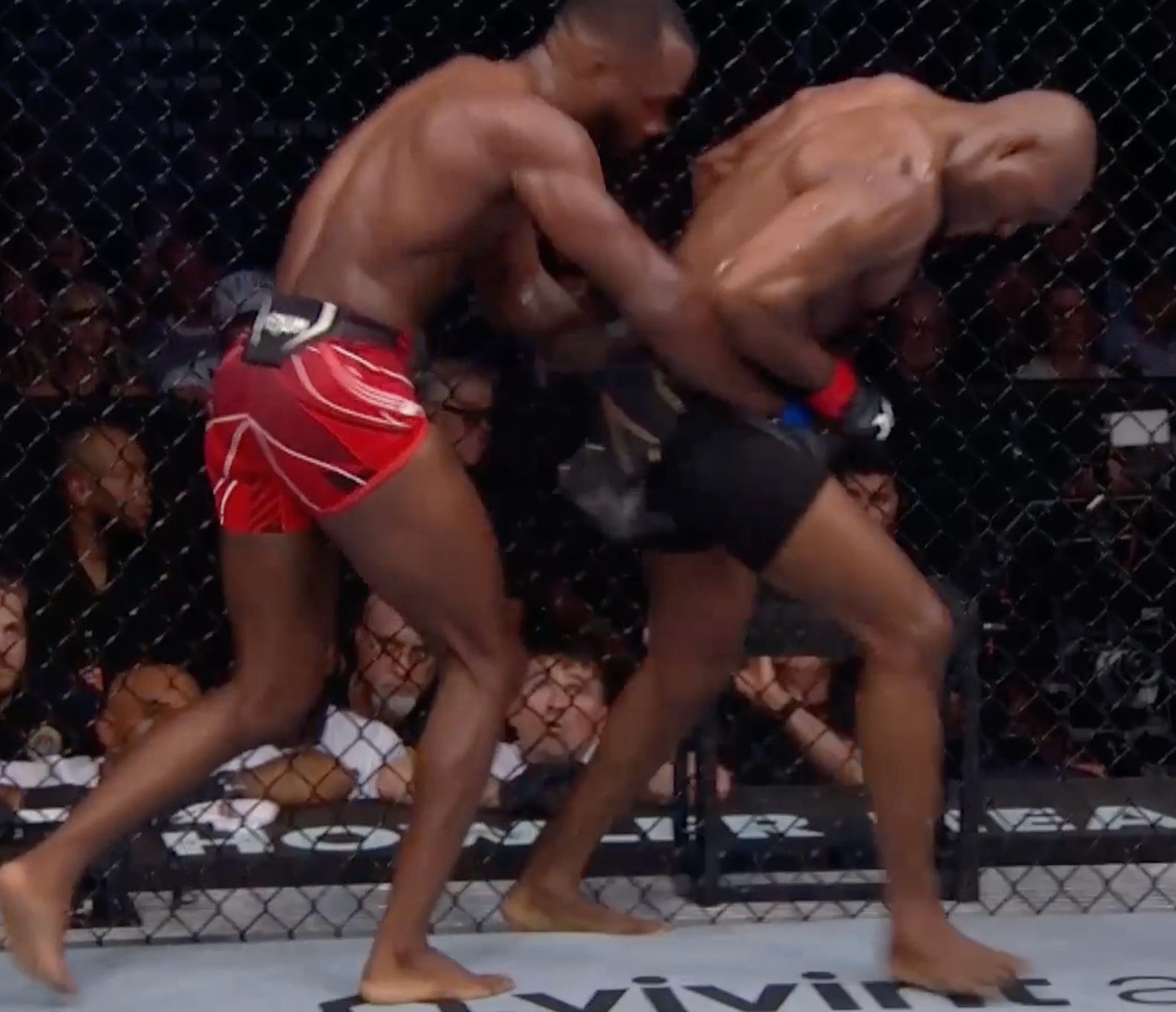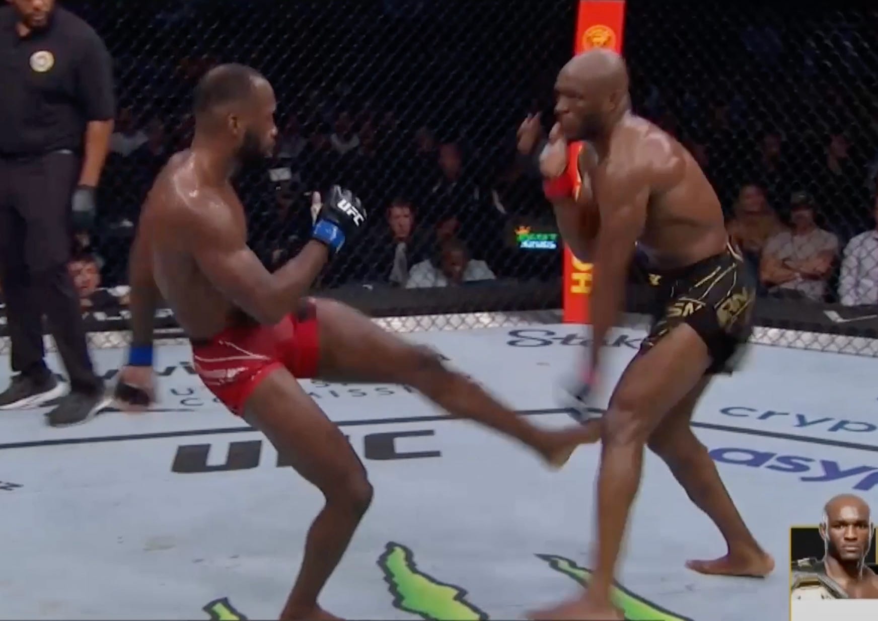 While intercepting knees and clinches allowed Leon to halt Usman’s offense, feinting and kicking allowed him to work from the outside. When not pressed up against the cage, Leon was able to feint into kicks with little to no resistance. While a feinted 1-2 most led to Usman’s unconscious body on the canvas, it was due to an accumulation of kicks to the leg and body that opened up this opportunity as well. Inside low kicks, sidekicks to the leg, and front snap kicks to the body all landed with regularity for Edwards.