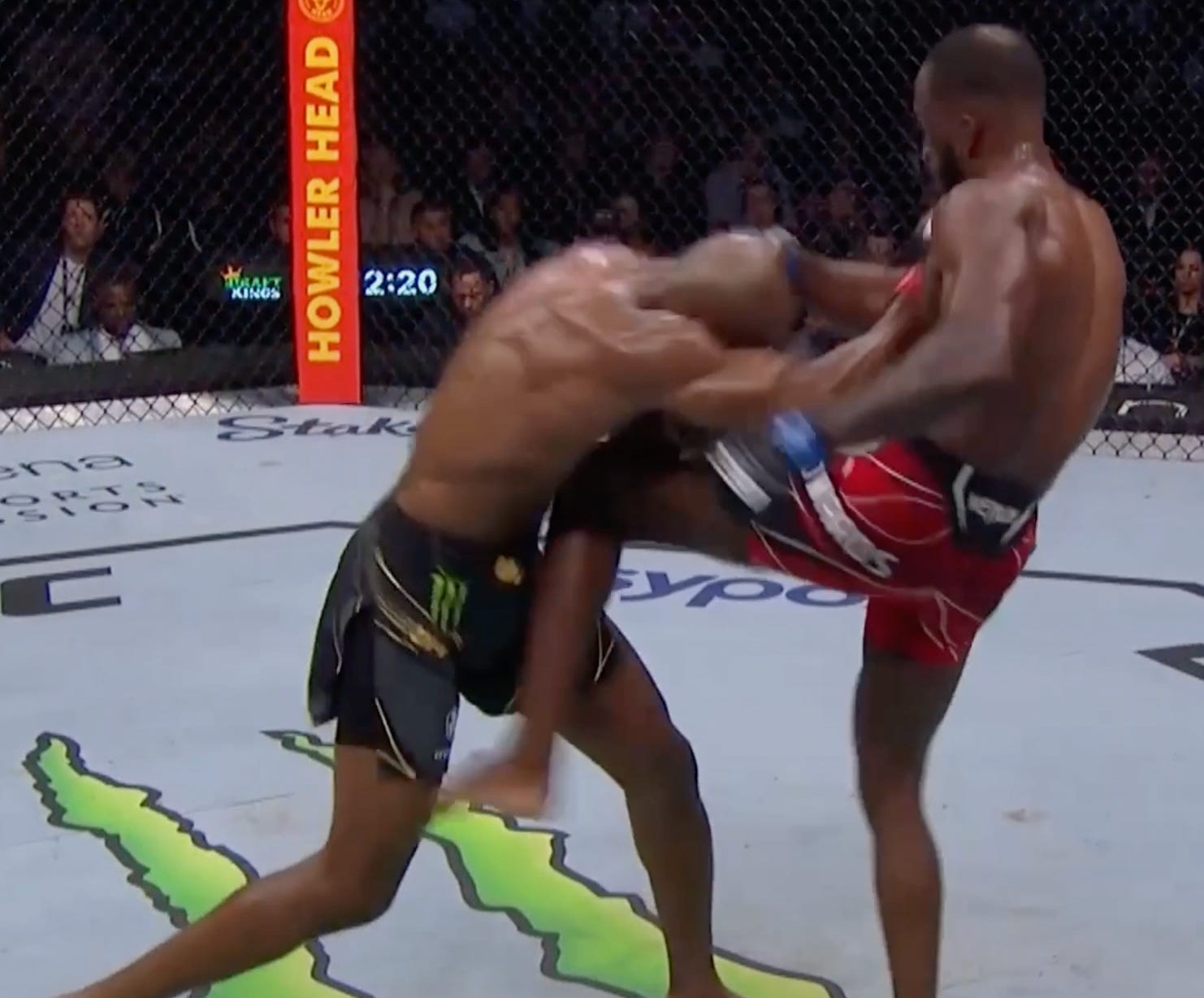 Intercepting knees are not seen often enough in MMA, as they are a great weapon for punishing an opponent coming in. During the fight Usman would step in big with a jab or cross only to be met with a knee up the middle to his head or body. This also worked as a counter to takedown and clinch attempts in open space.