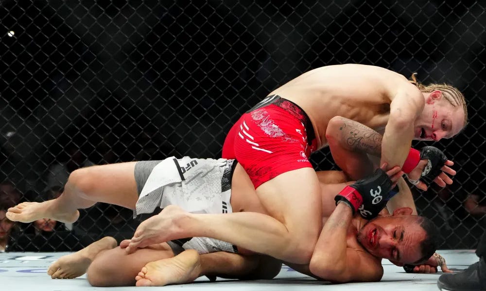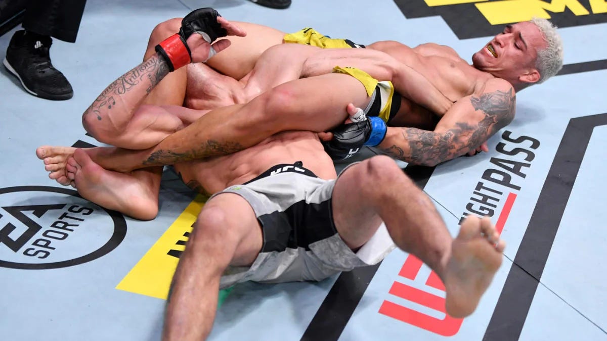Given Pimblett’s lack of tact in fighting the veteran Ferguson I was reminded of two fights. Two fights later champion Alexandre Pantoja had an entertaining and largely dominant match against a similarly scramble-heavy grappler in Brandon Royval, and years prior Charles Oliveira had his star-making performance in a grappling domination of the very same man Pimblett faced.