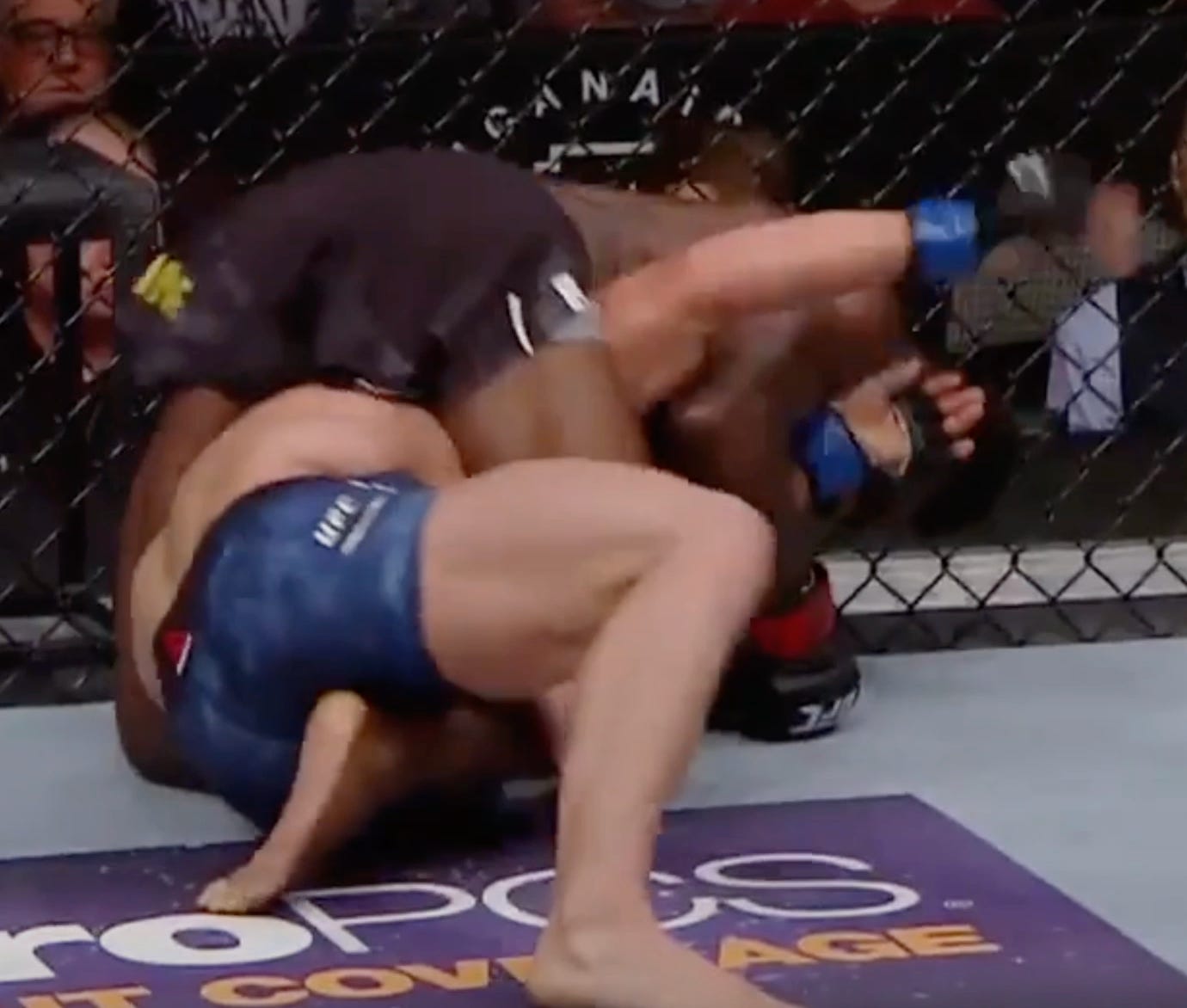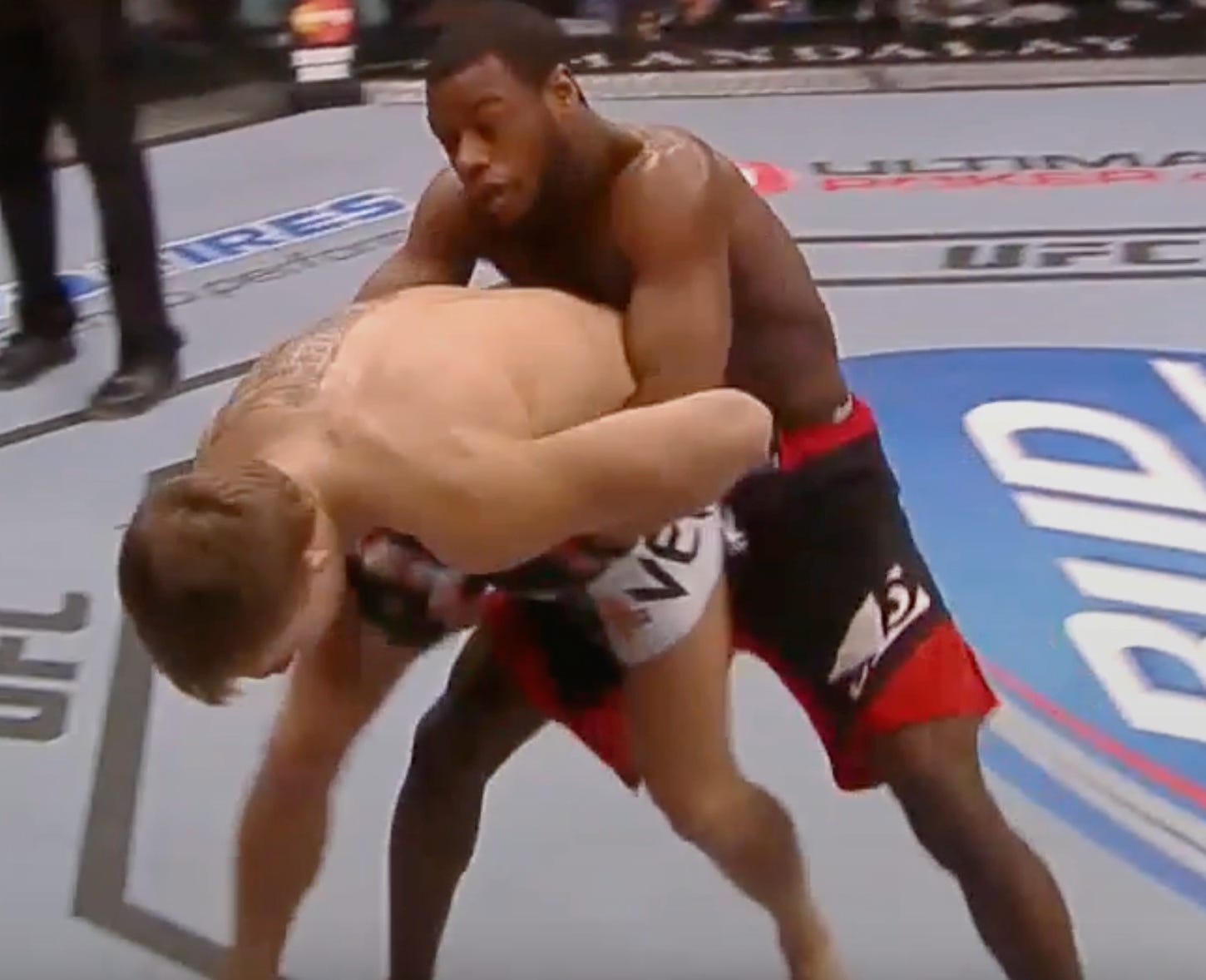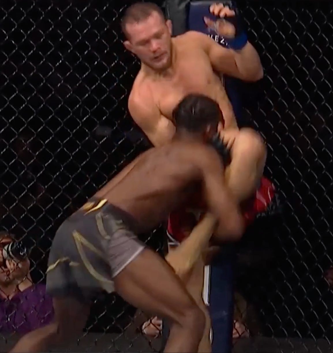 Aside from simply ducking into the opponent’s torso to grab the single leg, Sterling has a much safer strategy to obtain a single leg: when his opponent kicks. Given most of Sterling’s striking involves kicking at range, the opponent resorts to doing the same. When the return kick comes, Sterling is ready to catch it and convert it into a single leg. The opponent can turn away akin to Jose Aldo to defend, but this exposes the back as Yan does above.