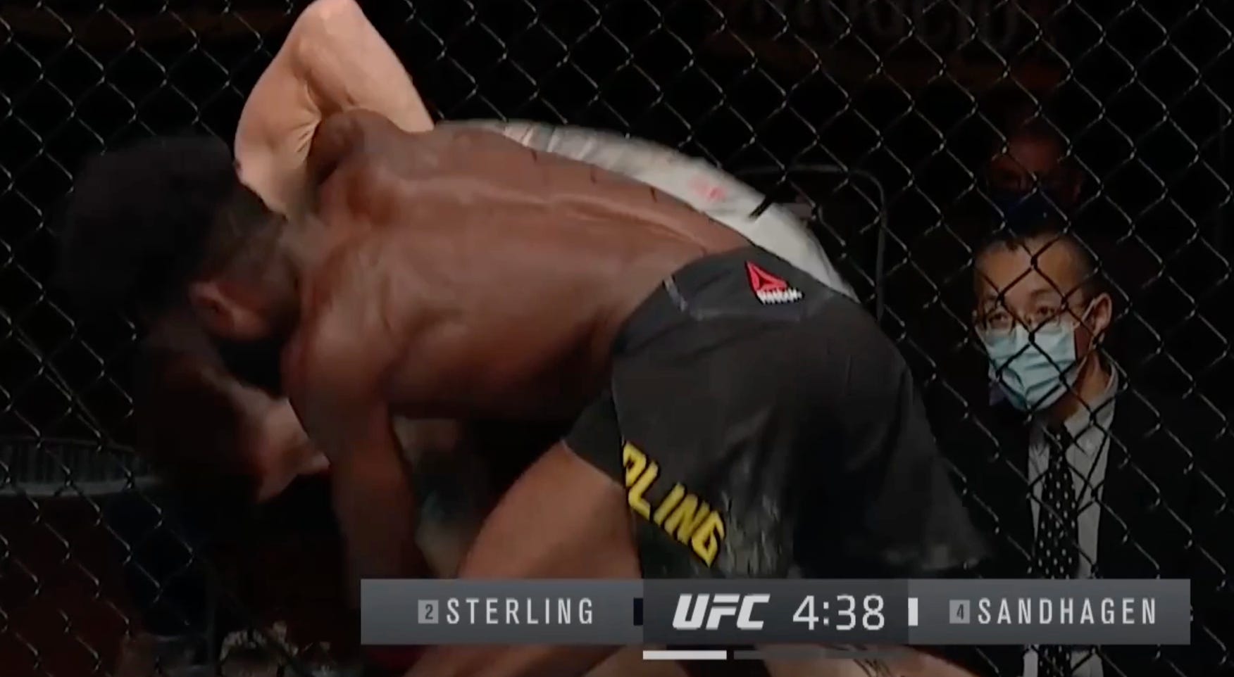 While pushing Sandhagen into the fence, Sterling digs his under hook and looks to grip Sandhagen’s opposite triceps