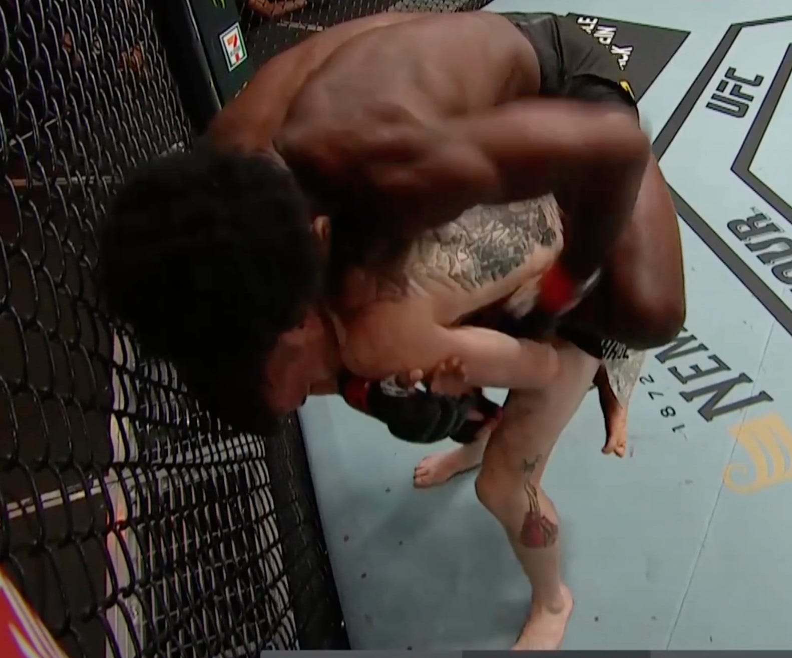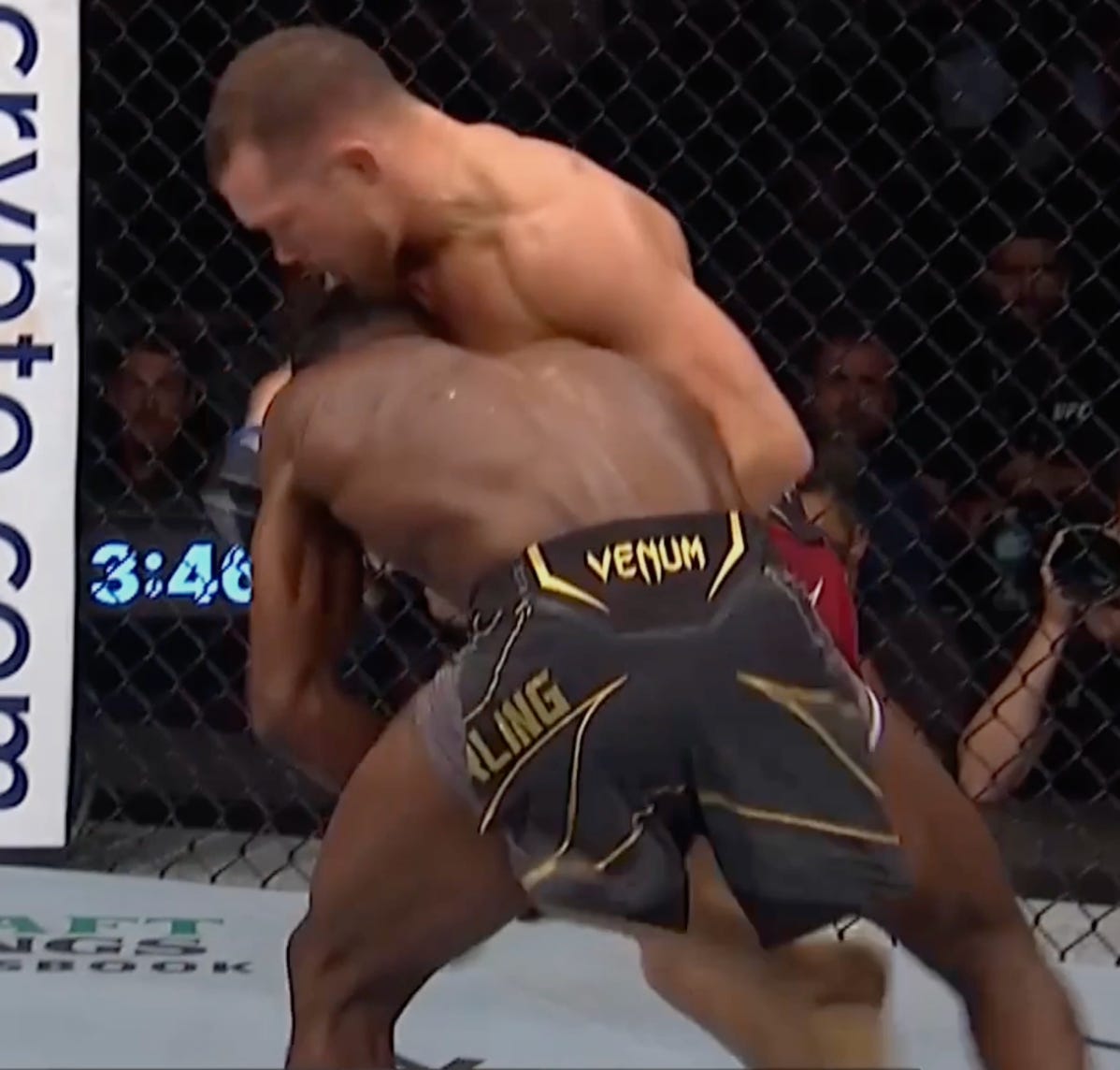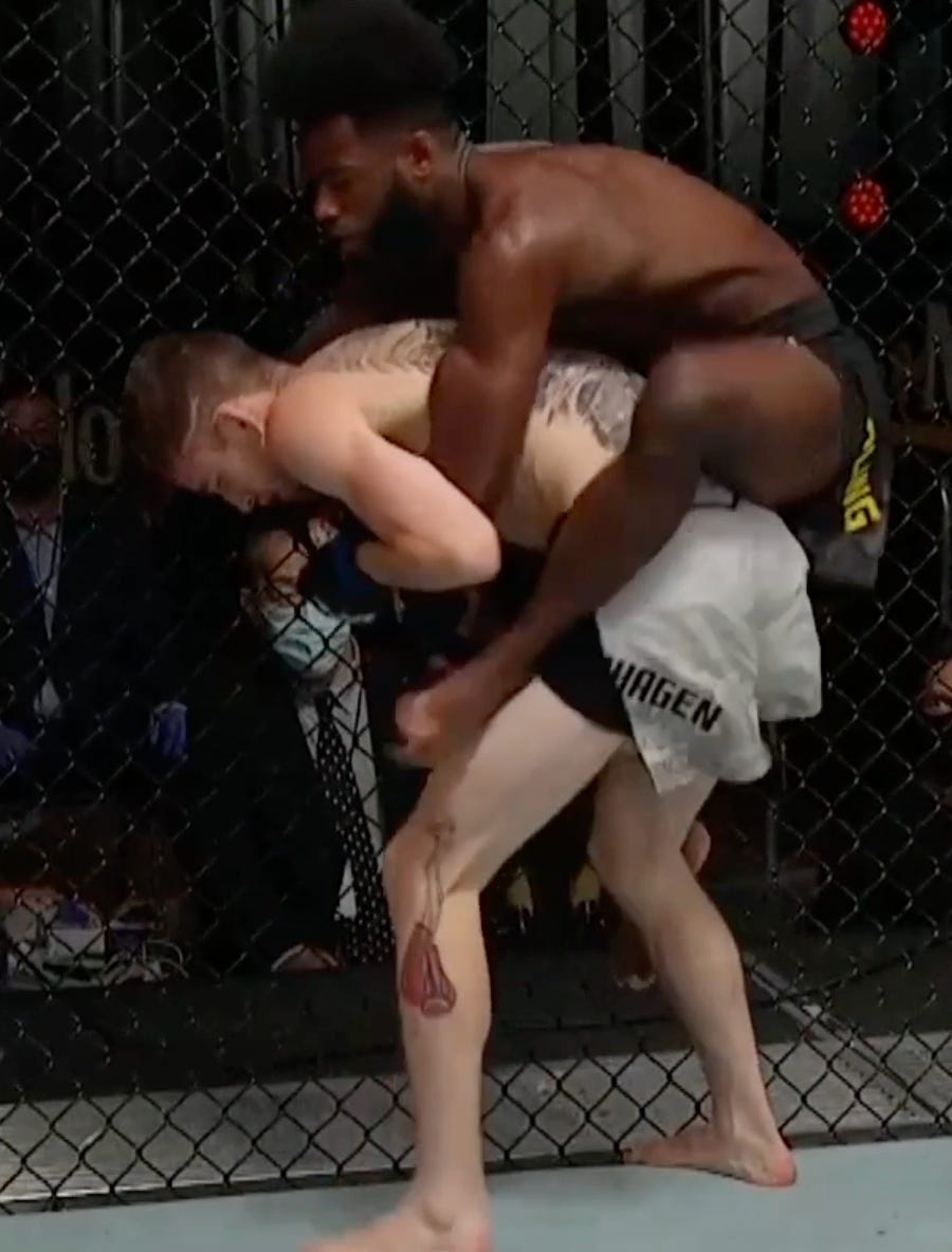 And jumps on the back once his under hook clears Sandhagen’s arm