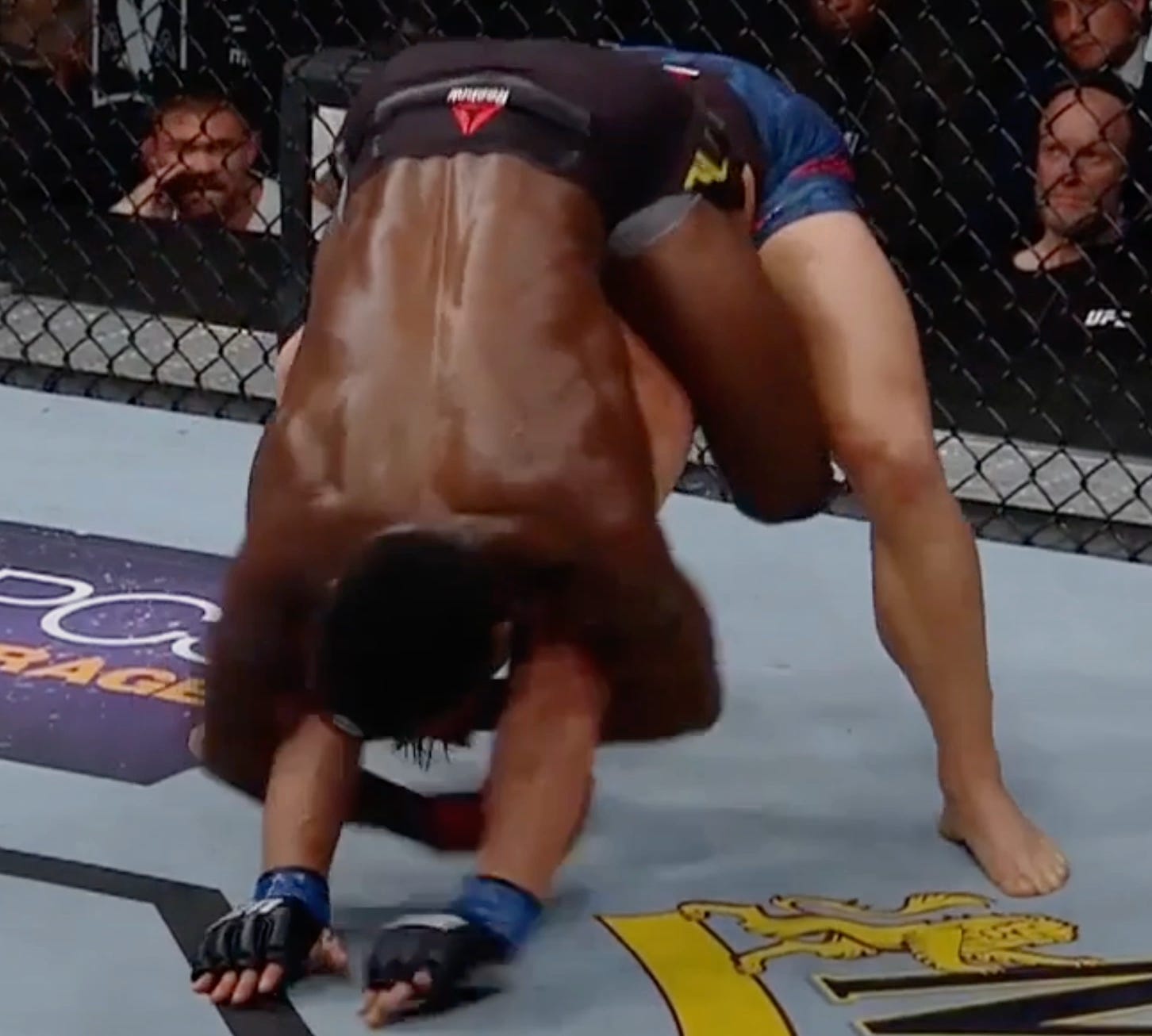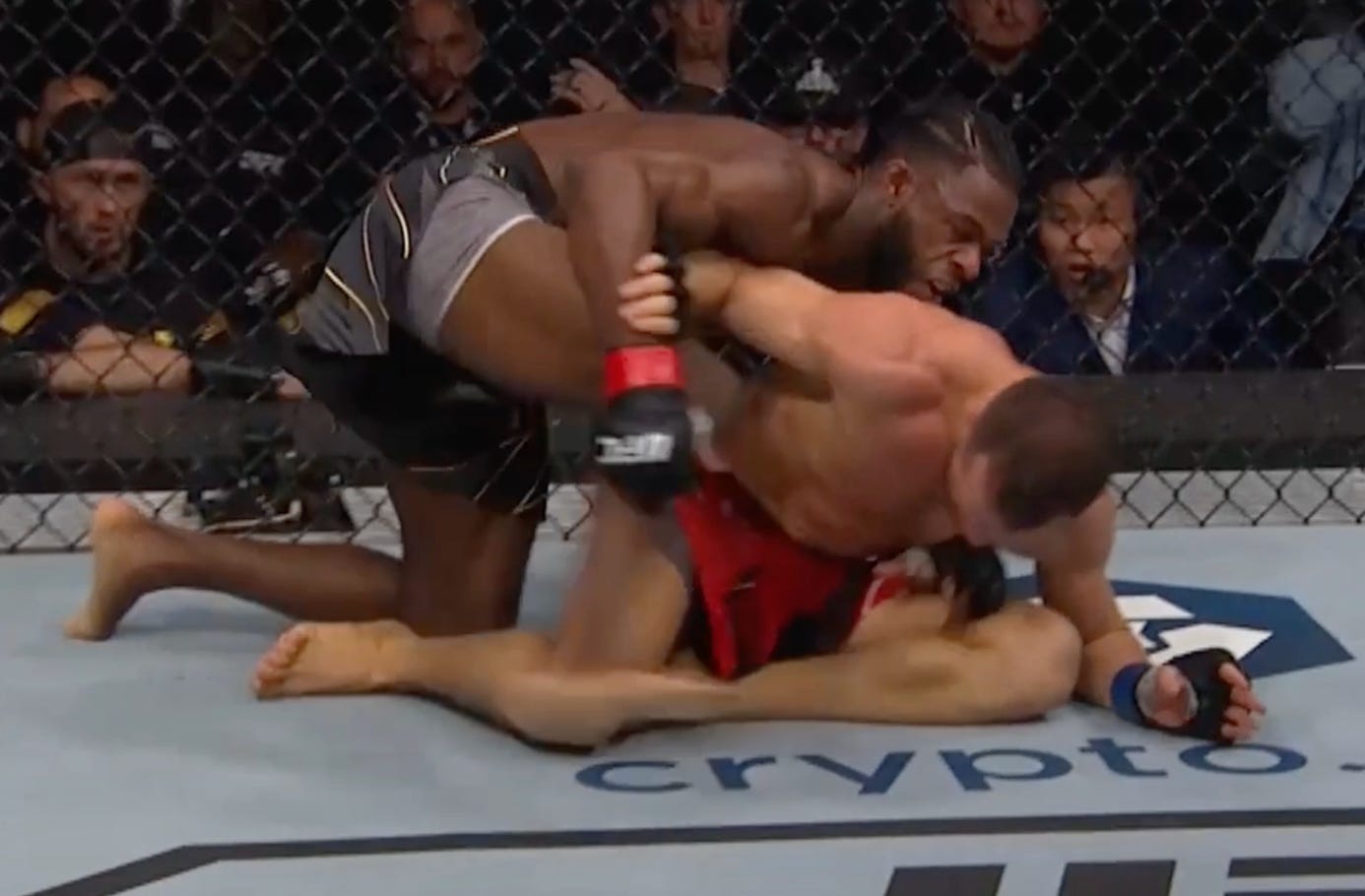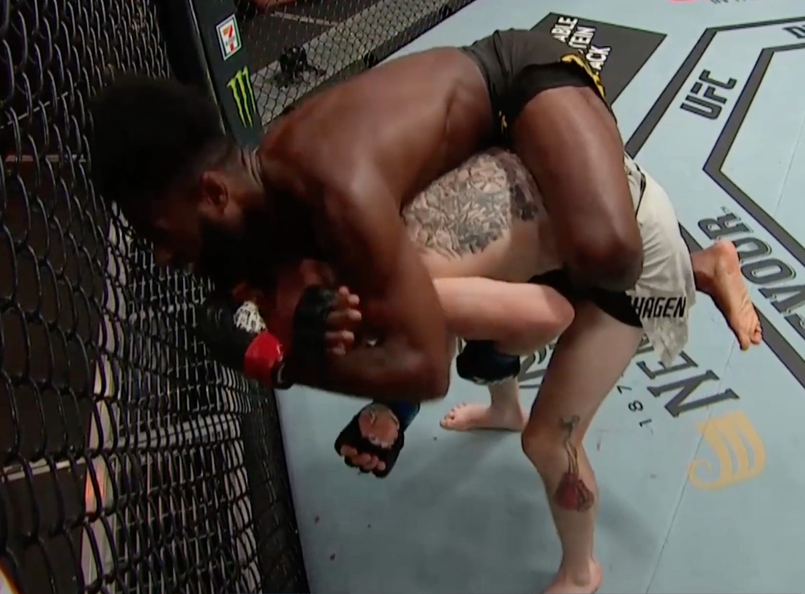 And jumps on the back once his under hook clears Sandhagen’s arm