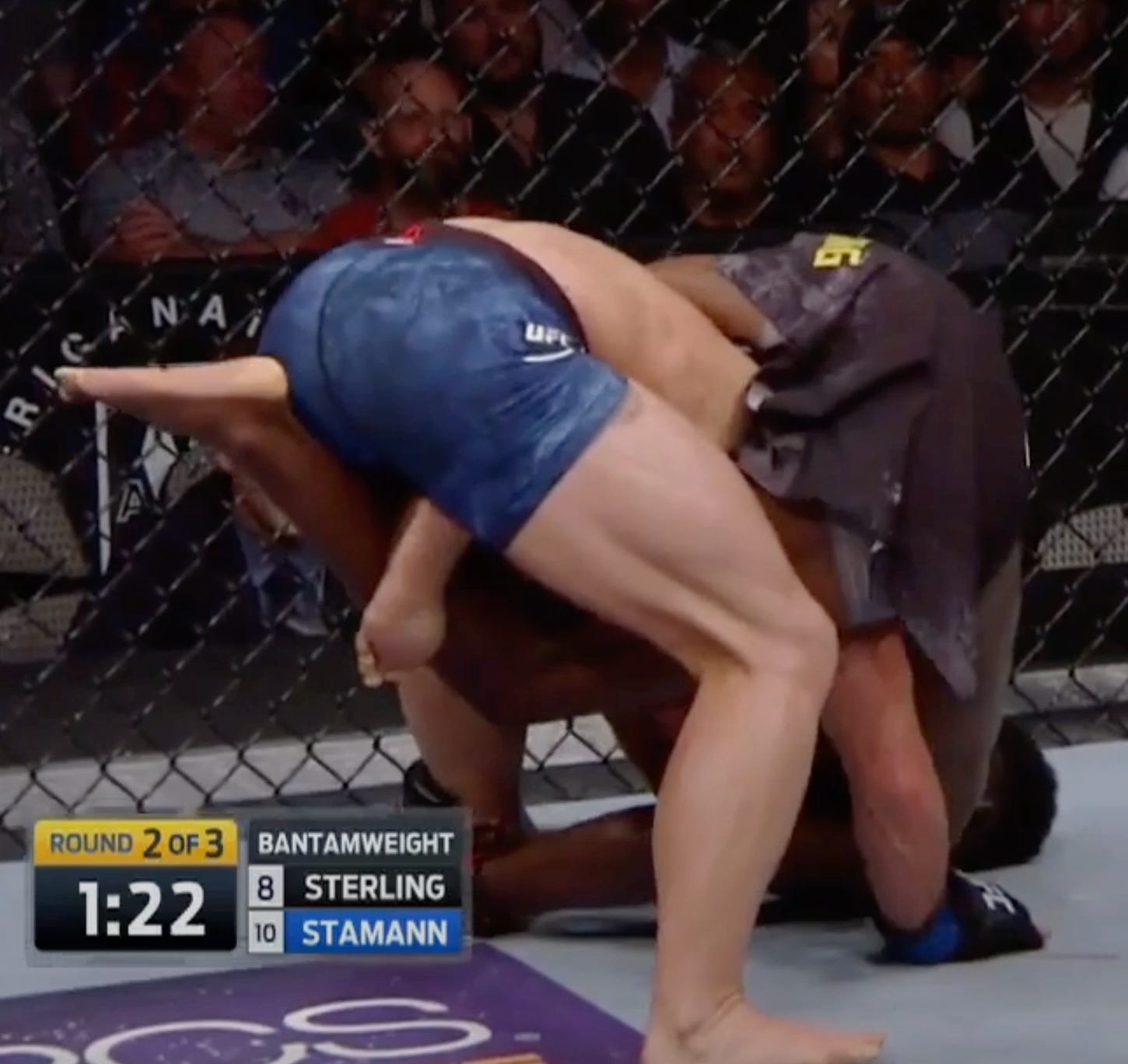 So he postures up to escape, but immediately gets grabbed around the neck by Sterling, who still has the body triangle