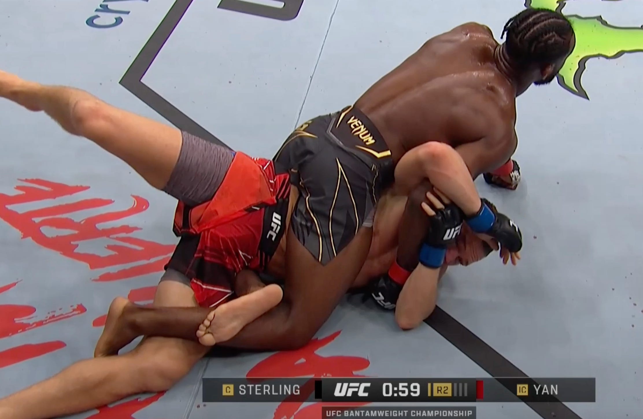 As Yan spins to his side, Sterling keeps one leg under to re-establish the body triangle and keep him from spinning to his back, and uses the other foot as a hook inside Yan’s thigh keeping pressure on his bottom leg to further inhibit his movement. Genius
